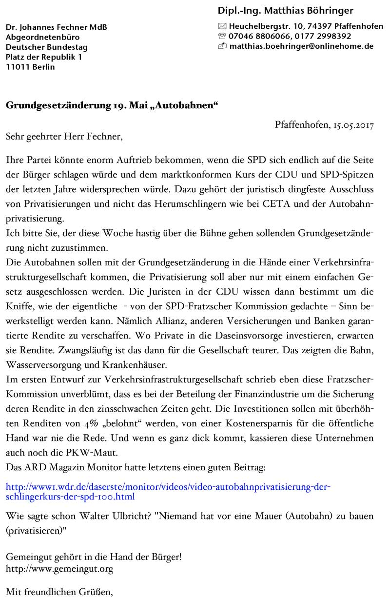 15.05.2017 an MdB Dr. Johannes Fechner (SPD): Grundgesetzänderung 19. Mai "Autobahnen" / Brief zum Aufruf von Marianne Grimmenstein "Privatisierungswelle stoppen"