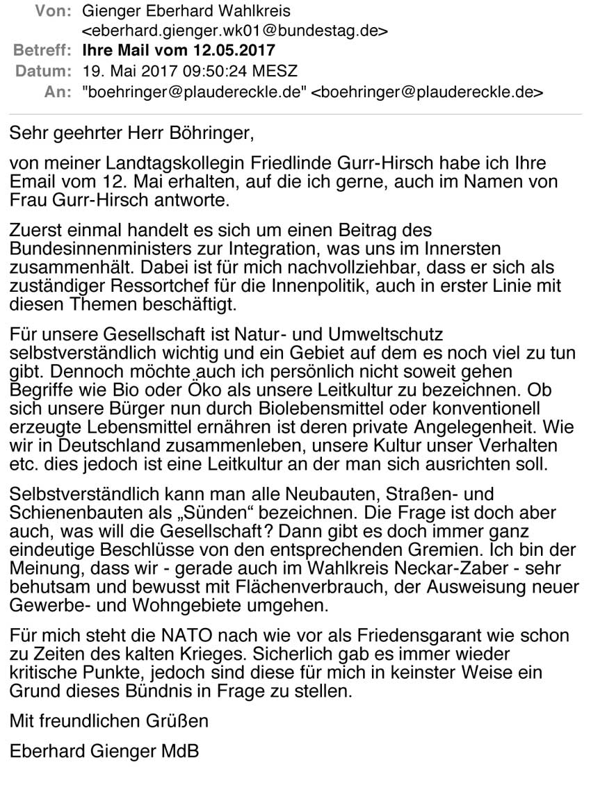 19.05.2017 Antwort von MdB Gienger auf die Mail an Staatssekretärin Friedlinde Gurr-Hirsch zu: Leitkultur ohne Kulturlandschaft? / Zu den 10 Thesen über Leitkultur des Innenministers de Maizière