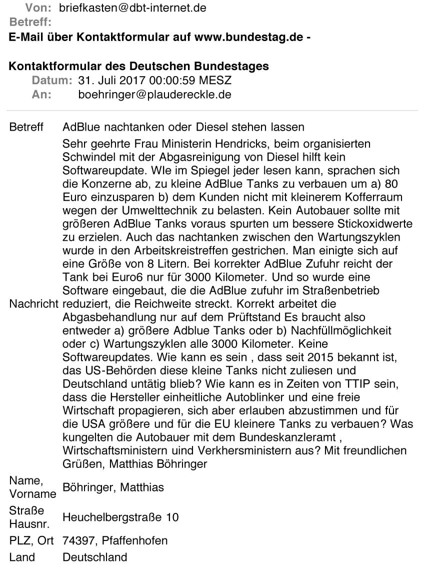 31.7.2017 an Bundesumweltministerin Barbara Hendricks: adBlue nachtanken oder Diesel stehen lassen