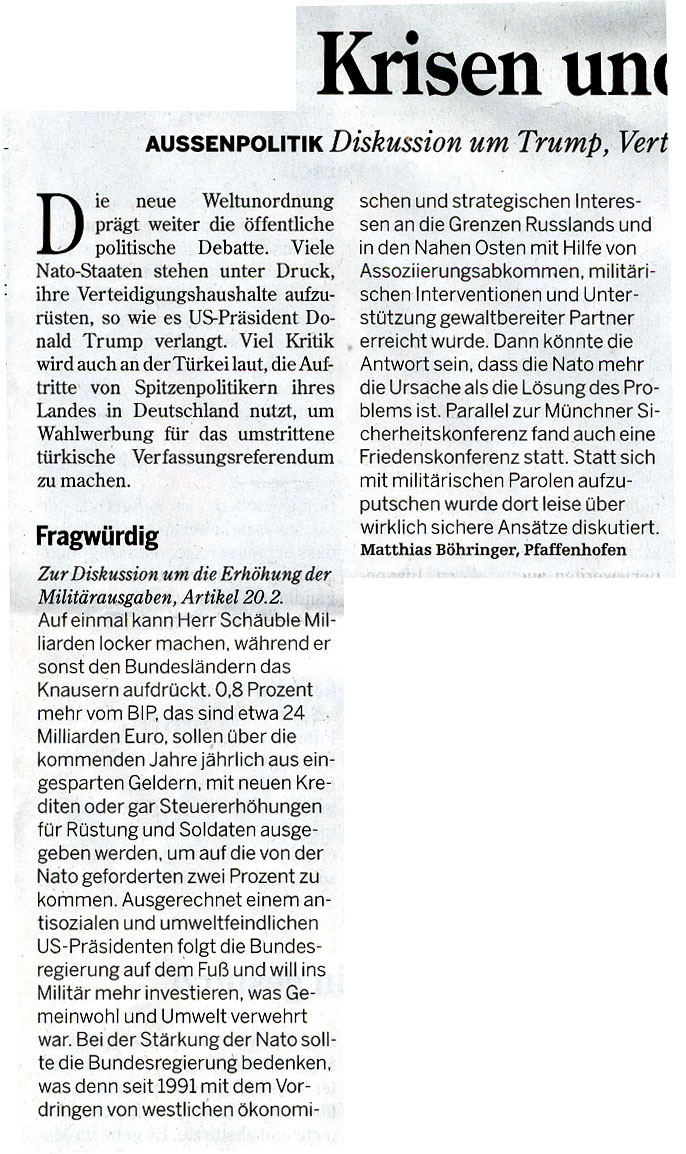 Leserbrief auf die Forderung der NATO, dass die Mitgliedstaaten ihre Rüstungshaushalte auf 2% des BIP aufstocken sollen. Wiederholt wurde diese Forderung von Vizepräsident Pence auf der Münchner Sicherheitskonferenz. Ausgerechnet Finanzminister Schäuble zeigte keine Ablehnung, bis zu 24 Milliarden Euro locker zu machen.