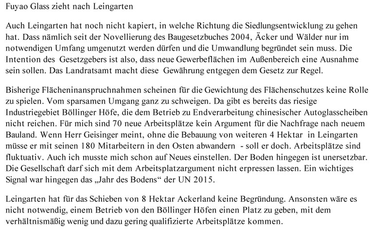 des Wachstums wird abermals unterlassen. Dabei ist der Irrsinn offensichtlich, dass Fuyao Glass das riesige Industriegebiet Böllinger Höfe