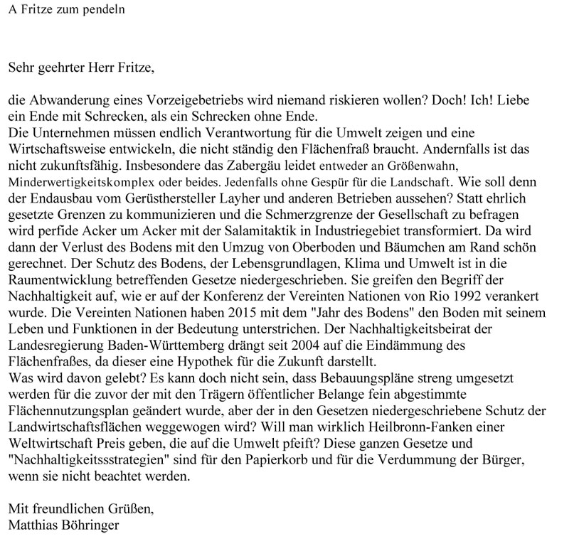 Für die sogenannten "Hidden Champions" ist die Region Heilbronn mit Umland bereit, sich völlig zu entstellen, Lebensgrundlagen entgegen des im Gesetz verbrieften Schutzes zu opfern. Auch die Heilbronner Stimme steigt da gerne in die Lobhudelei mit ein. Symptome dieses Wachstums werden zwar benannt, es werden aber keine Konsequenzen gezogen. Um ein Zeichen zu setzen, dass man diese ewige Erpressung mit dem drohenden Wegzug nicht mitmacht, muss eben konsequent mal nein gesagt werden, die Abwanderung riskiert werden und aus der Salamitaktik ausgestiegen werden.