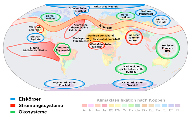 des Klimawandels, teils zur irreversiblen Störung der Ökosysteme und Lebensbedingungen: Schmelzen der reflektierenden Polkappen, auftauen der Methan-speichernden Permafrostböden, abschwächen der Nordatlantischen Umwälzpumpe, absterben der Regenwälder und borealen Wälder, Störung des Meeresbiologie durch Erwärmung und Versauerung, insgesamt 16 Elemente gibt es.